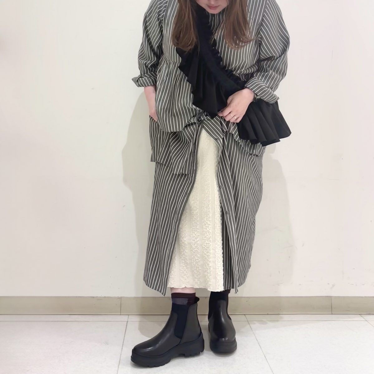 スカートの丈が短く肌が見える場合は、靴下を合わせるのもおすすめです♪