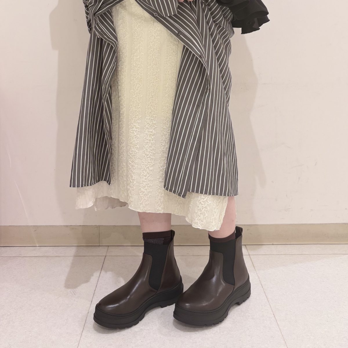 足元をダークブラウンのショートブーツにすることで