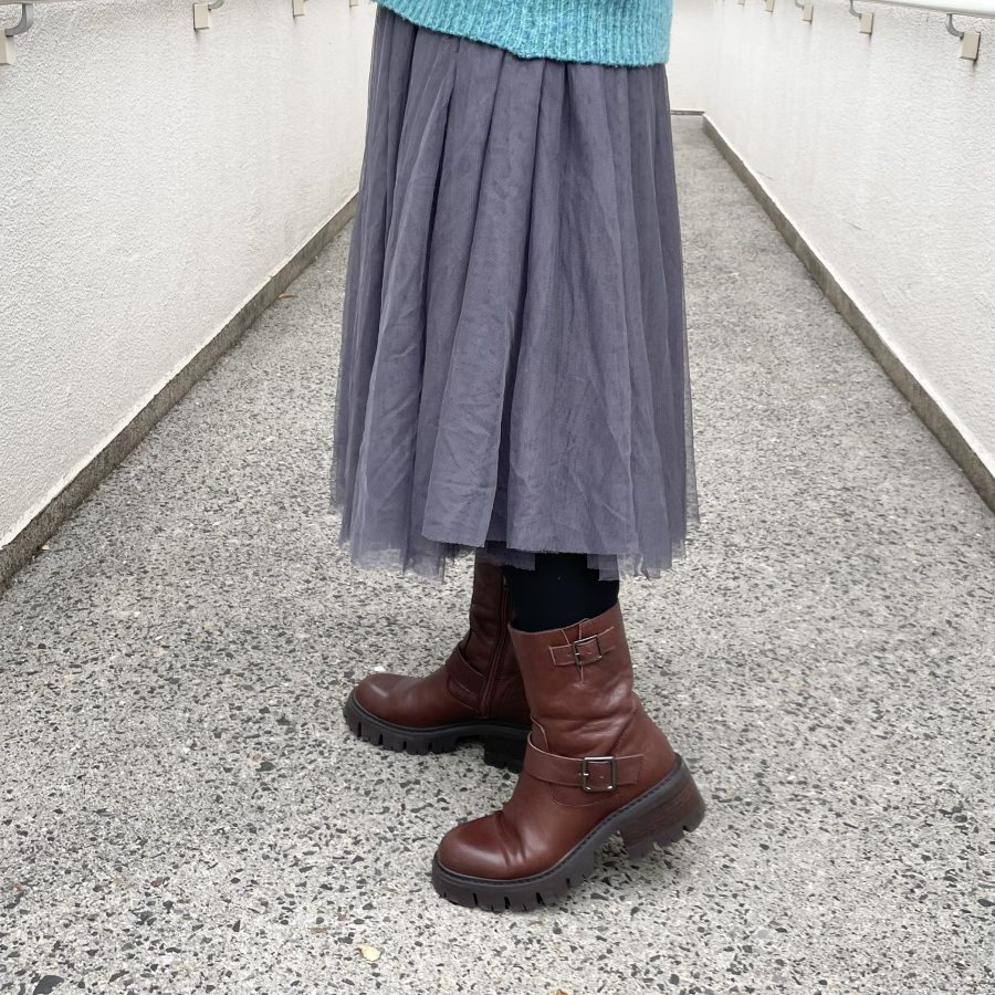 このエンジニアブーツも少し赤みのあるブラウンなので、黒タイツと合わせるとブーツがアクセントになります🙆♀️
