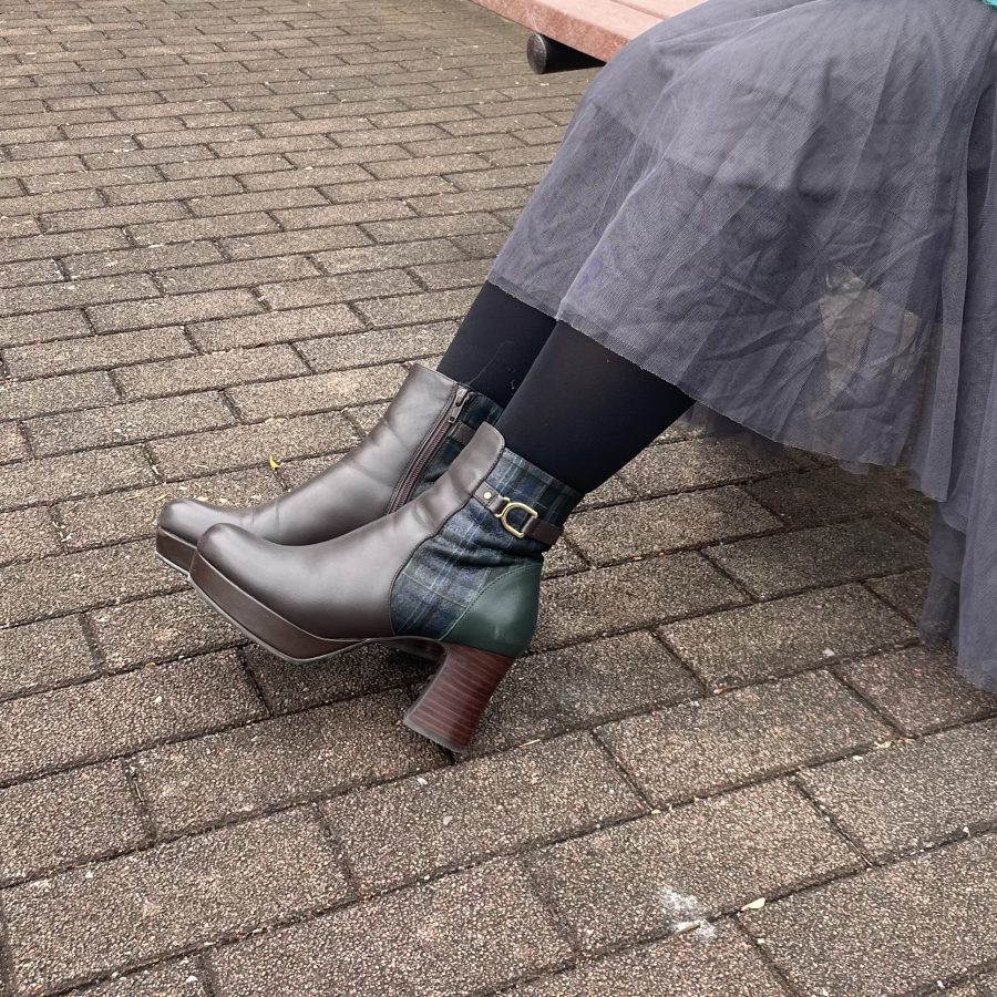 前回、黒タイツと合わせる茶色系ブーツをご紹介したのですが、今回は今年人気の柄が入っているブーツで合わせてみました☺️