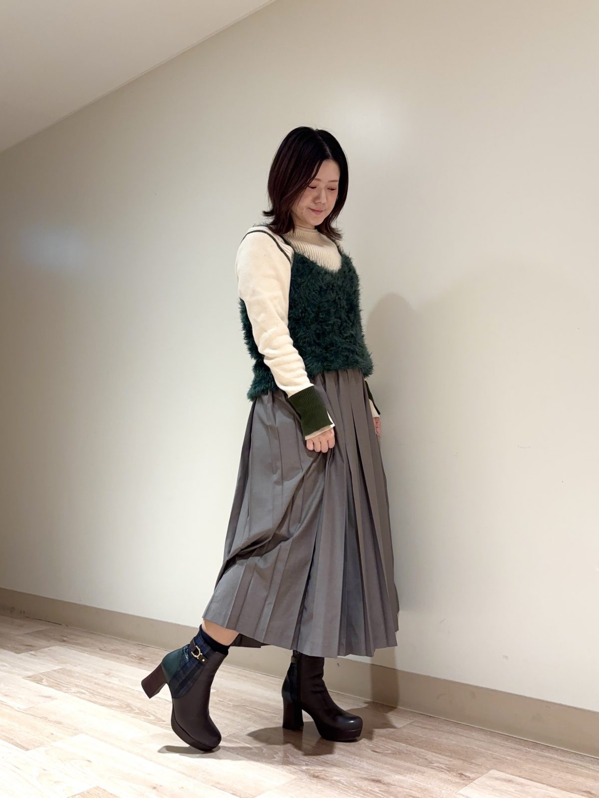 ファーのトップスに合わせて、グリーンが差し色のヒールブーツを履いてみました💚