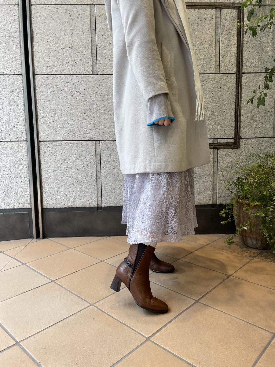 こちらのブーツはヒールの高さが5.5cmなのですが、柔らかい革で足首をホールドされ足が滑り落ちないのでとっても歩きやすいブーツです🤎