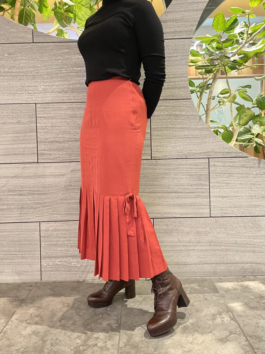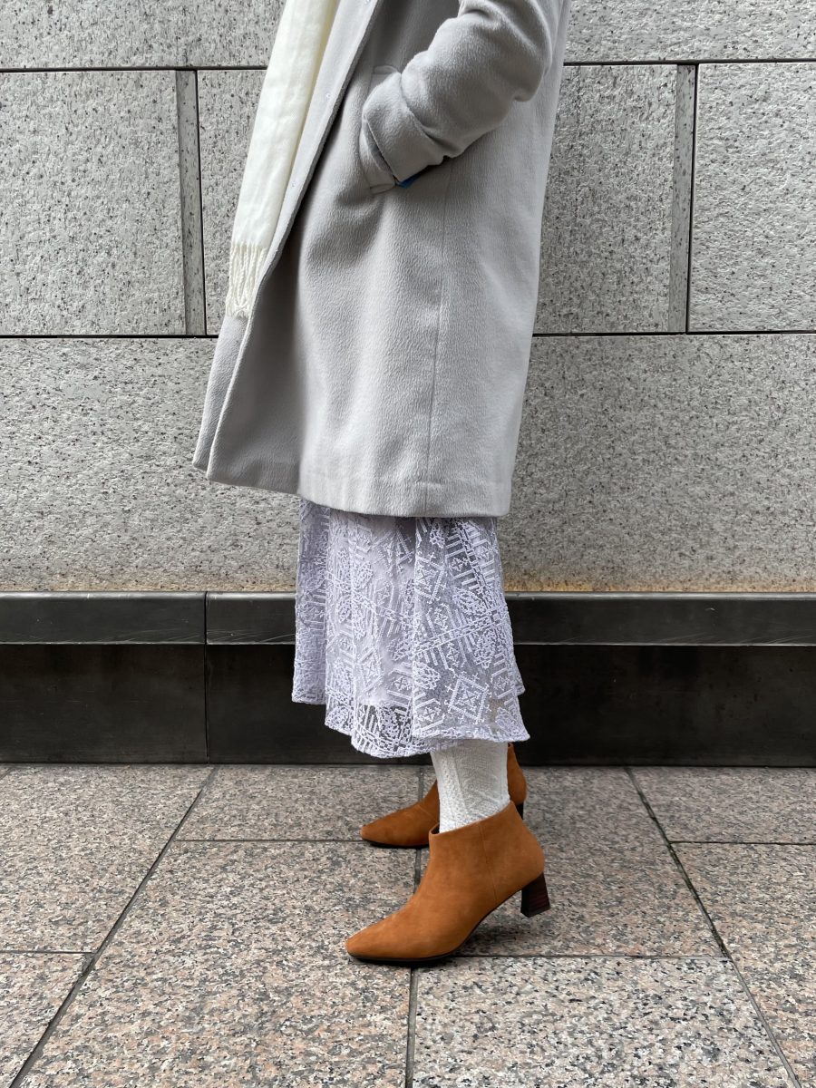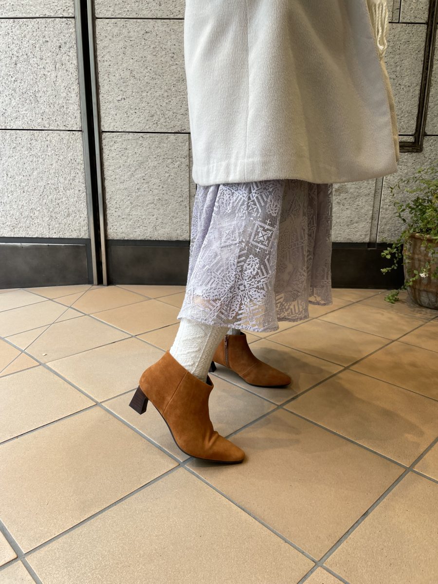 こちらのブーティはつま先がポインテッドトゥなので、下まで広がる様なロングコートとの相性バッチリ😉