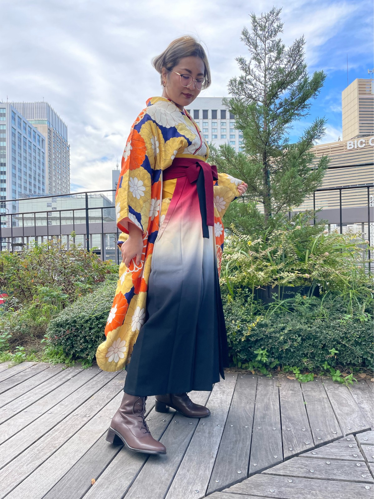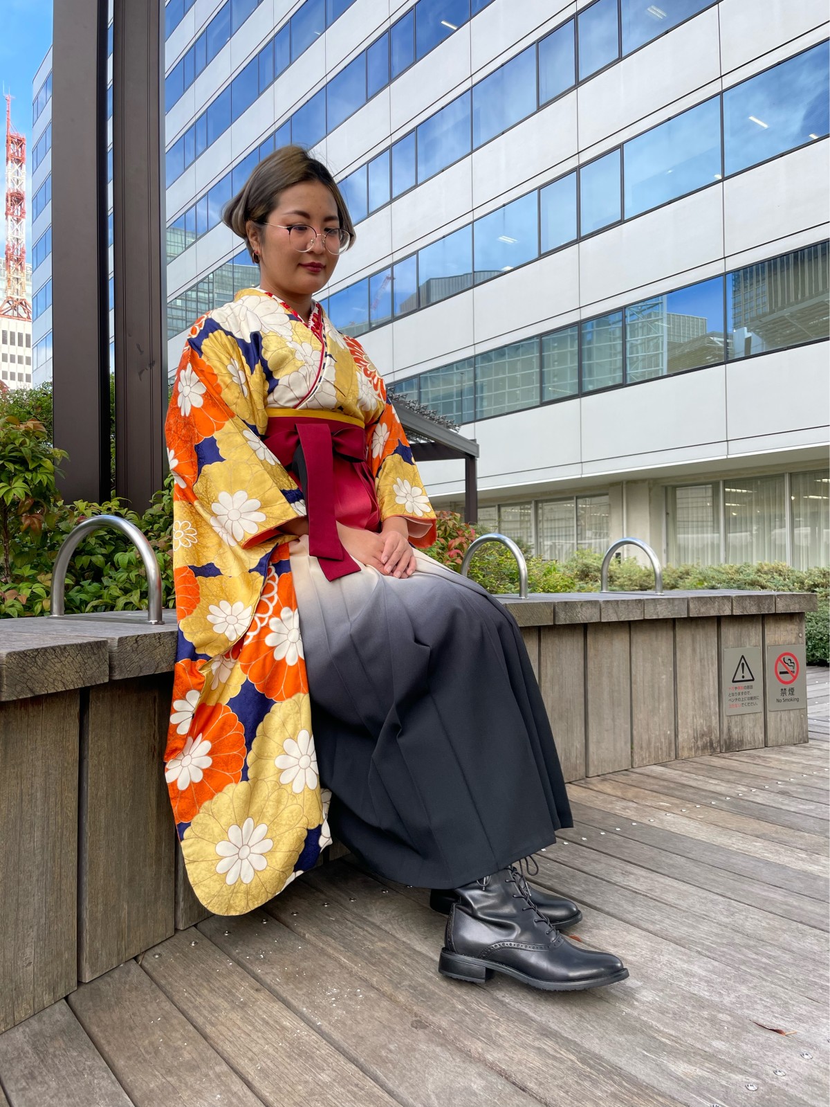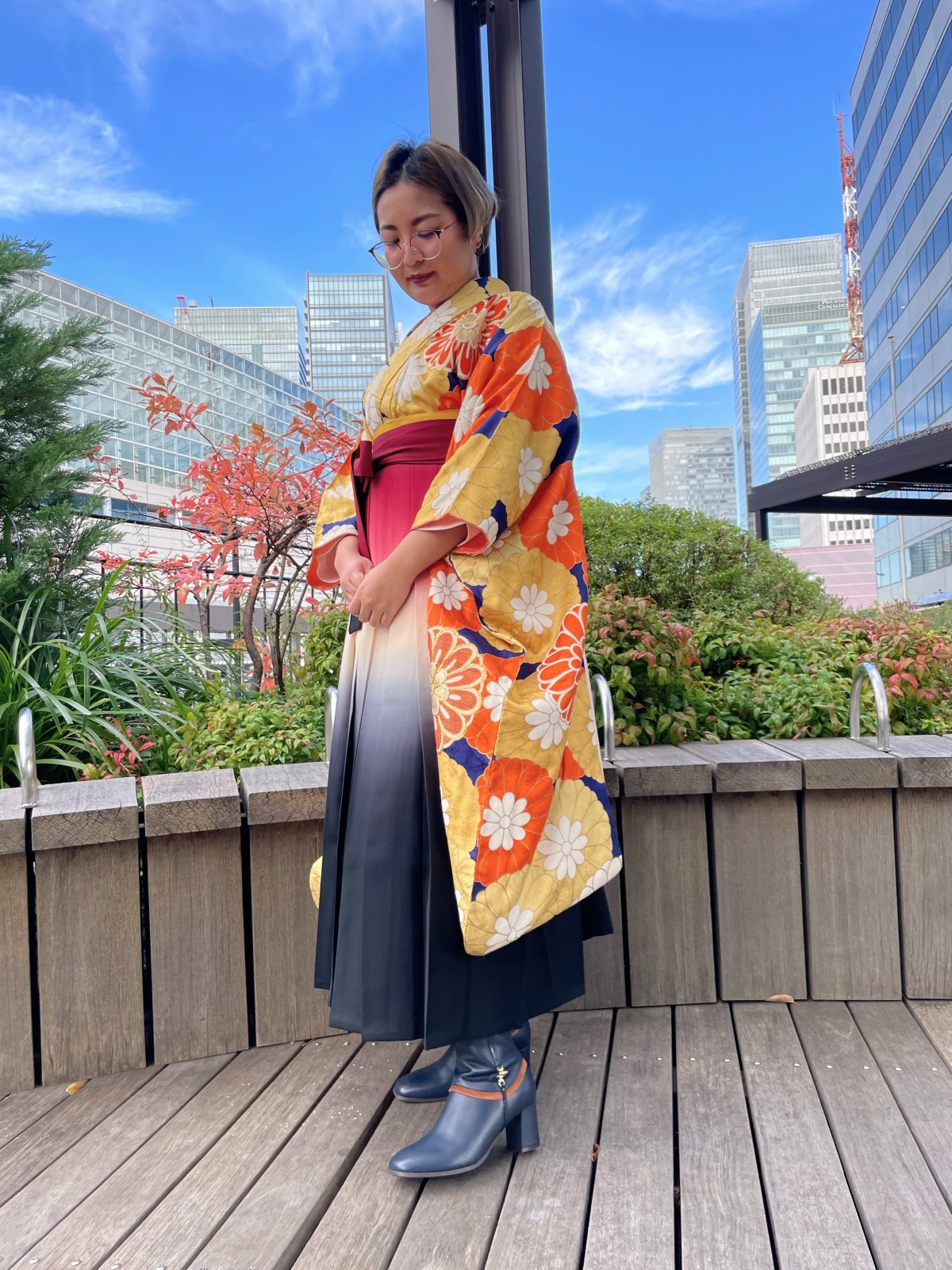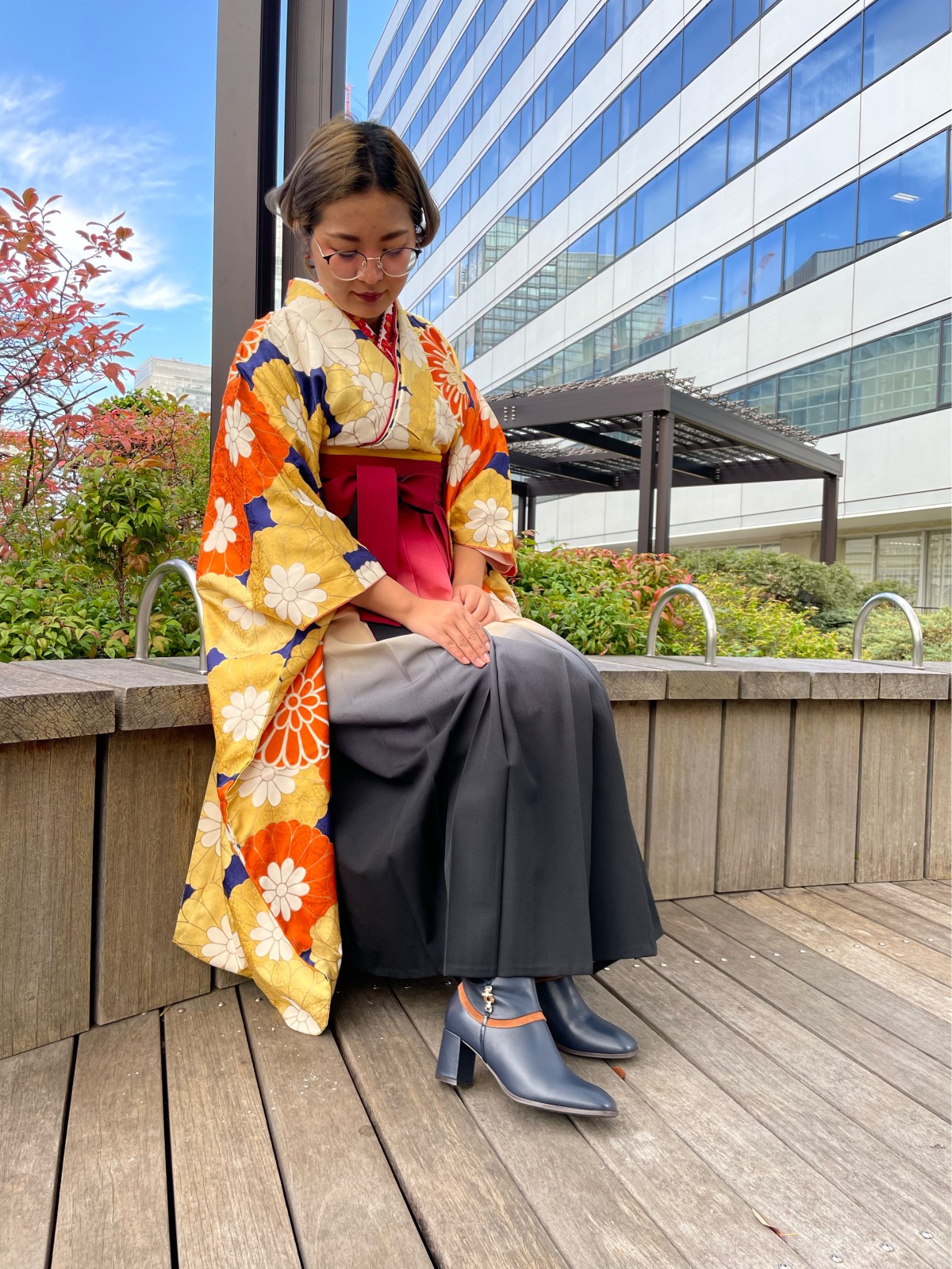 振袖と袴にも入ったネイビーとオレンジラインでぐっとおしゃれに見えますね🥰