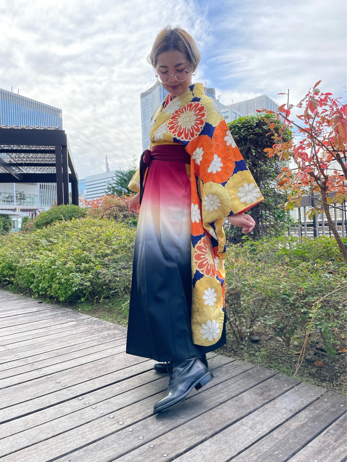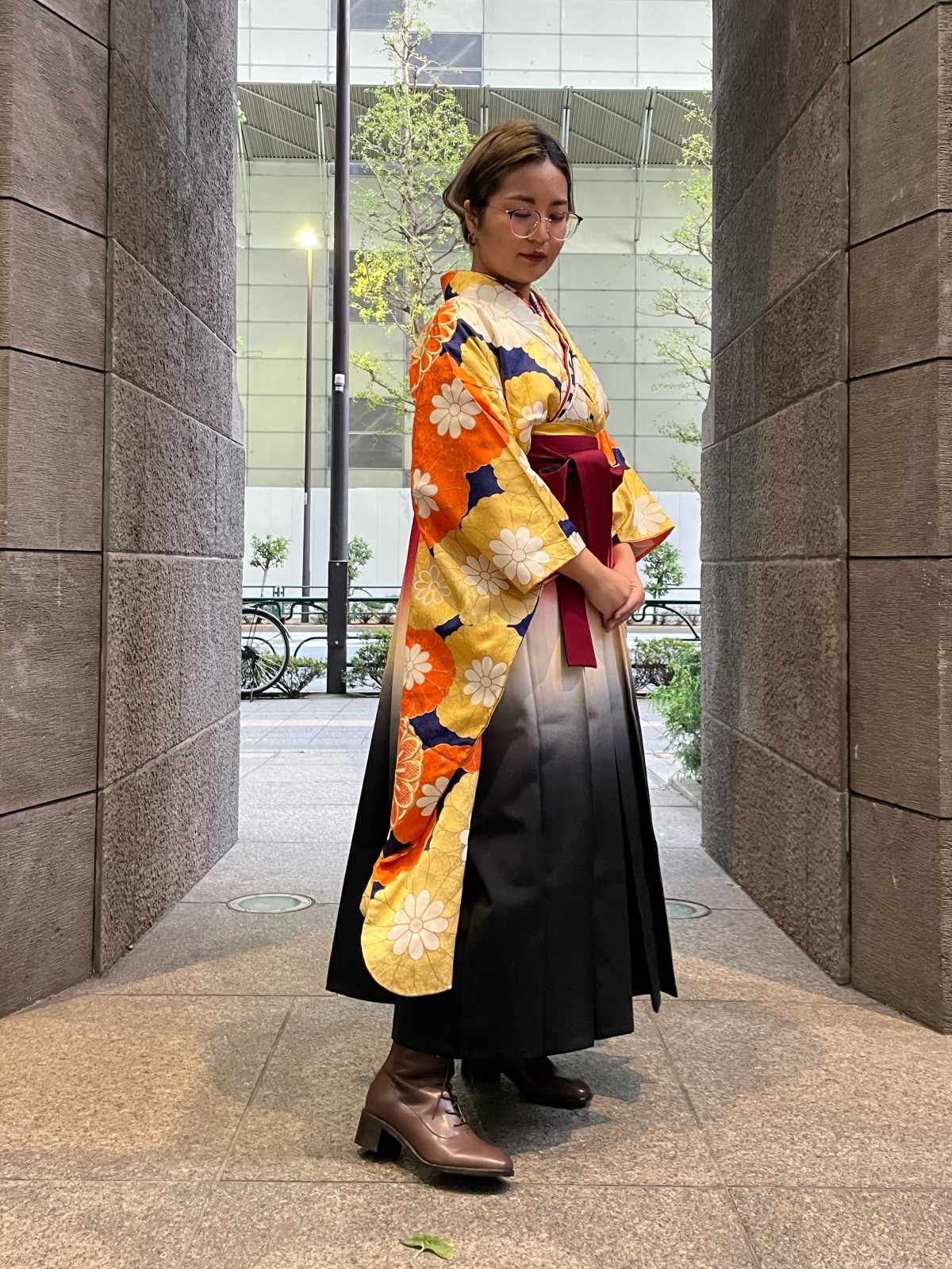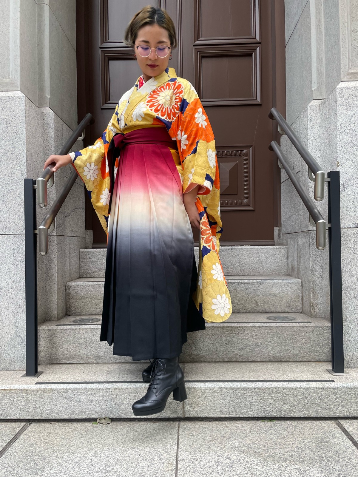 振袖と袴にも入ったネイビーとオレンジラインでぐっとおしゃれに見えますね🥰