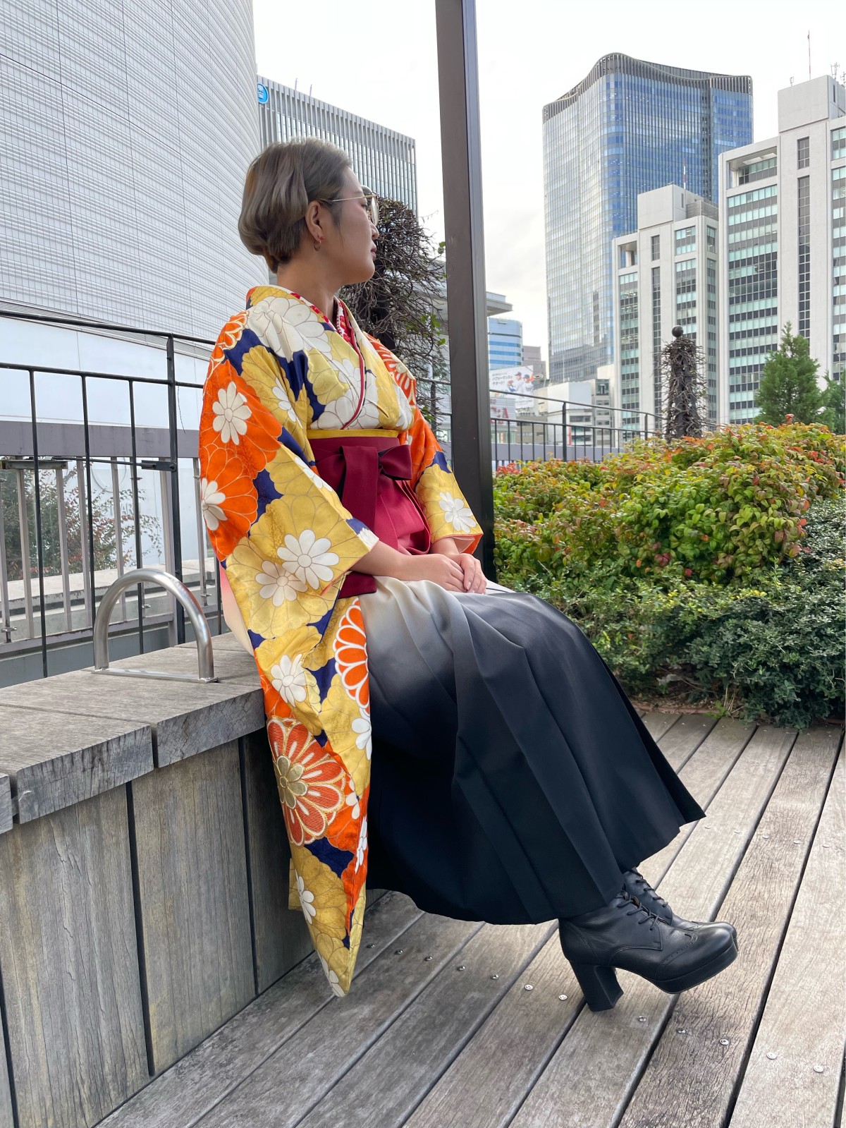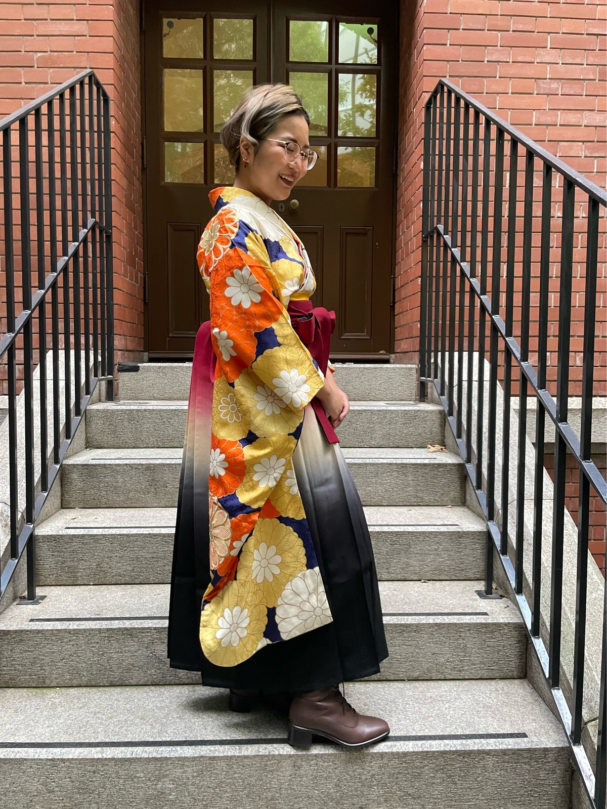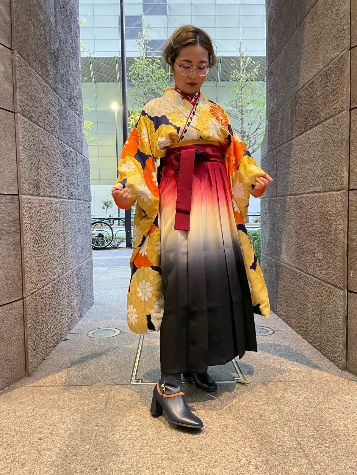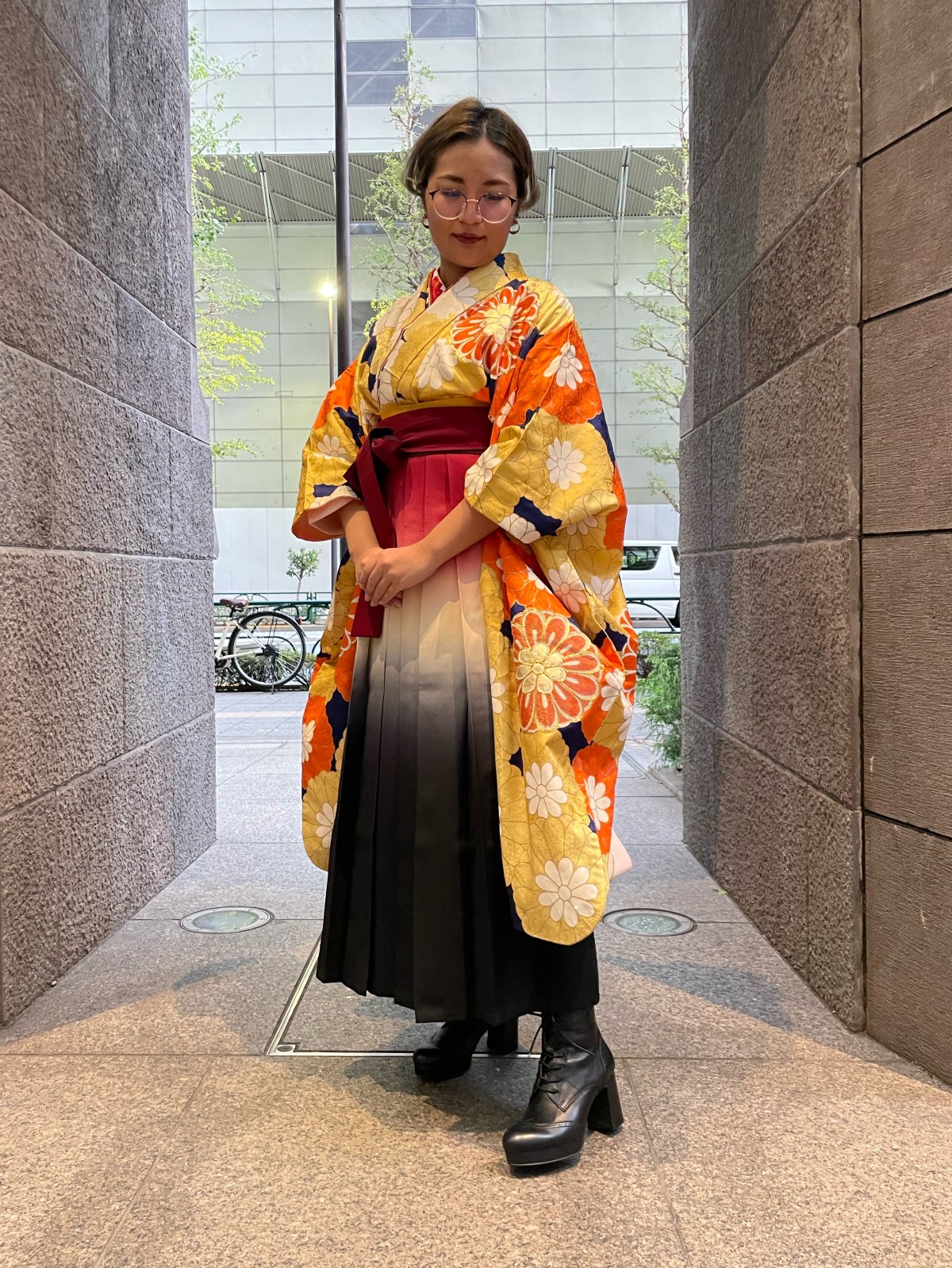 振袖と袴にも入ったネイビーとオレンジラインでぐっとおしゃれに見えますね🥰