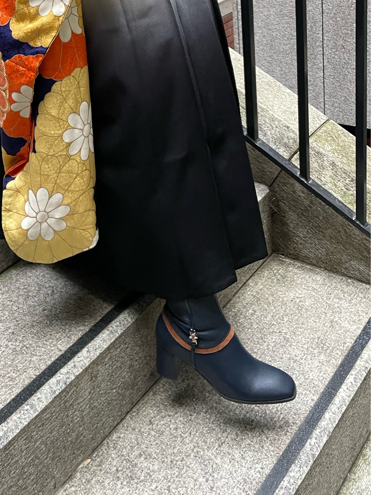 卒業式の袴ブーツ|③ネイビーの袴×品ありレザーブーツ