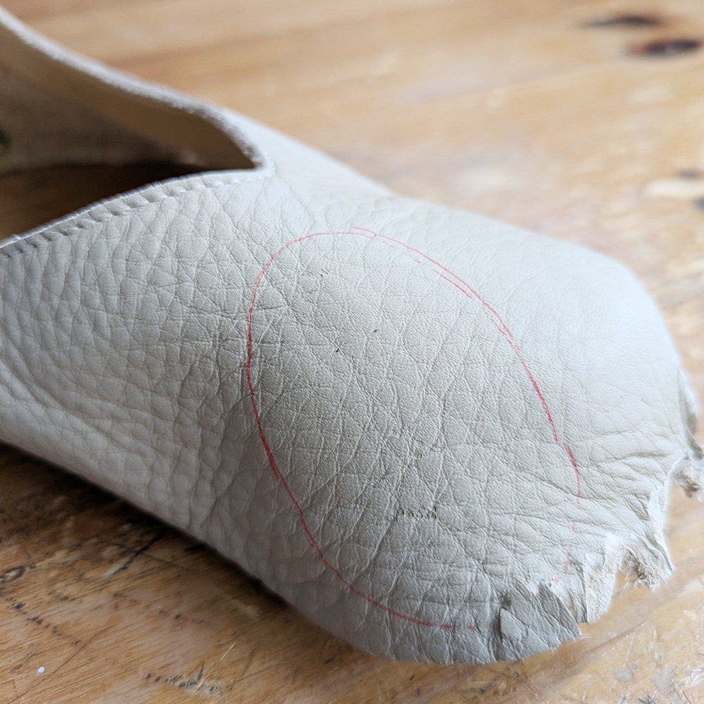 靴にする場合は、そういった”使えない部分”を避けてアッパーの型を入れていきます。