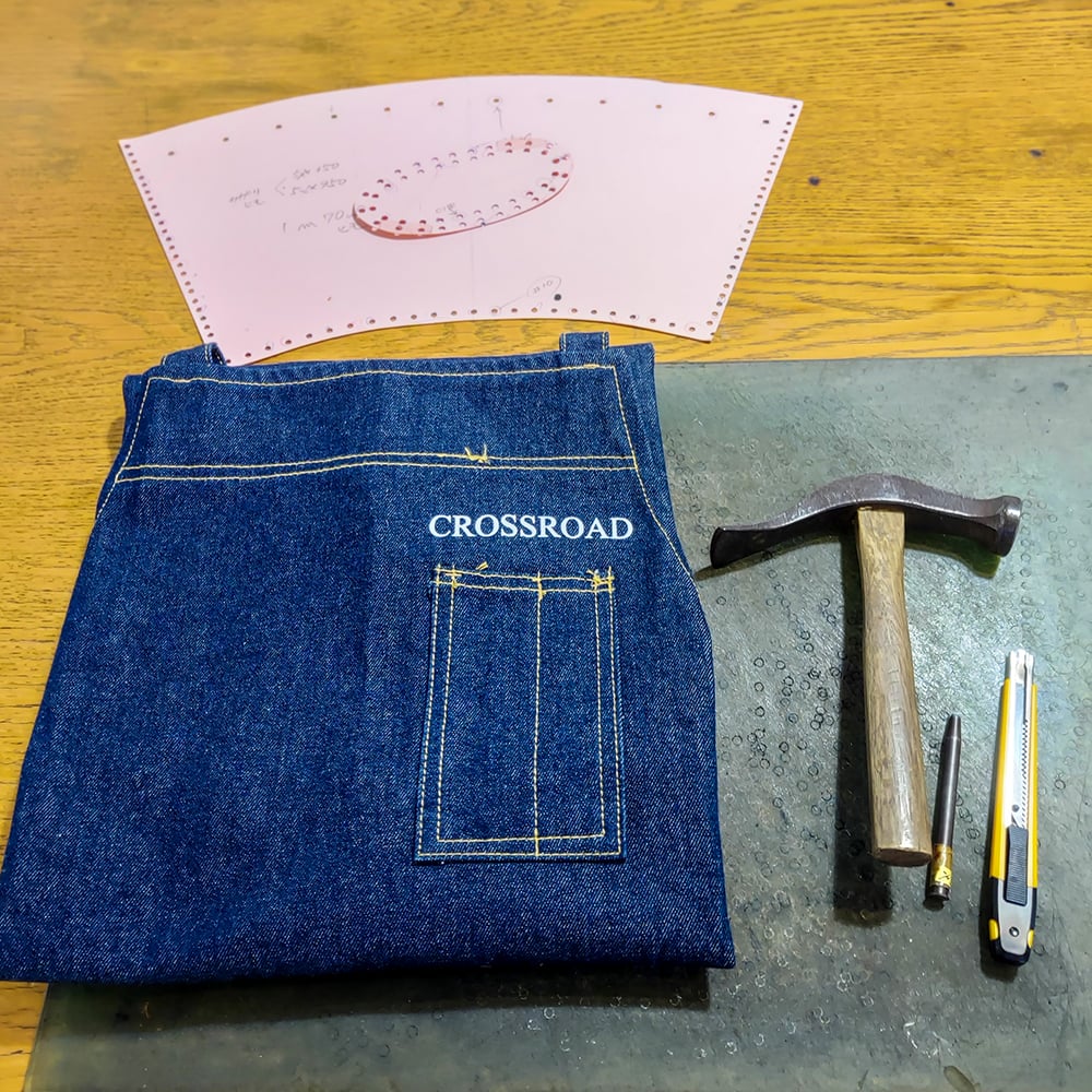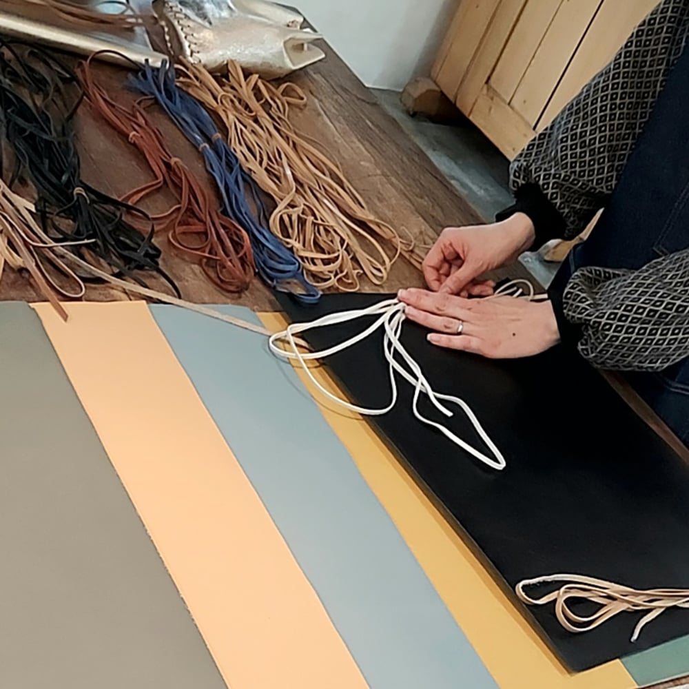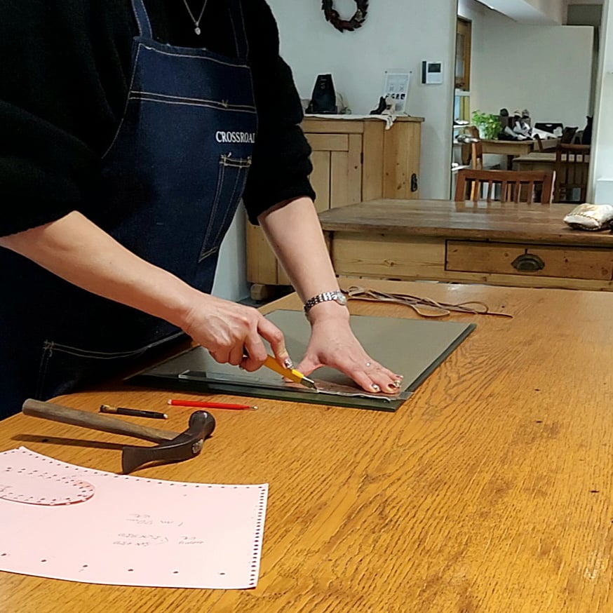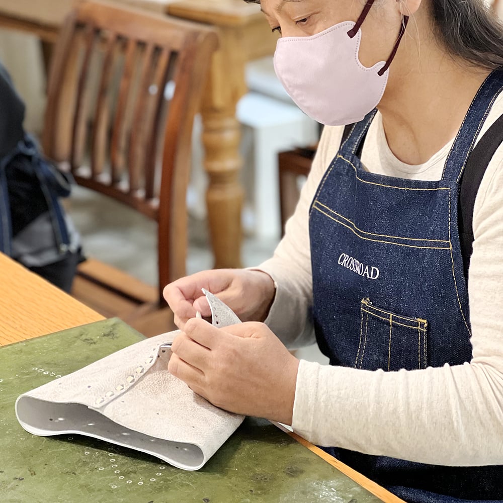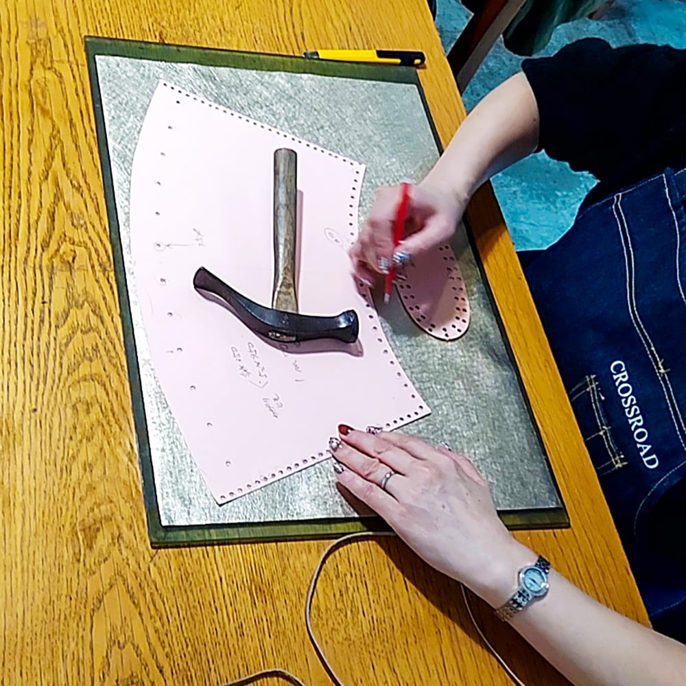カッターで裁断して穴をあけ、革ひもで縫っていく…と工程をざっくりいうとこの3つ。