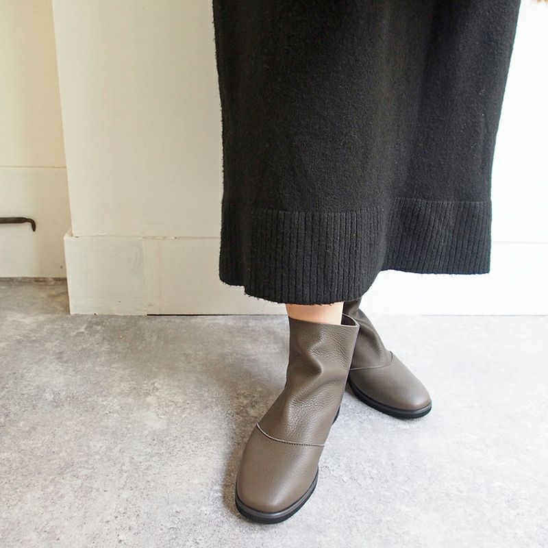 くたっと感のあるやわらかレザーに厚みのあるスポンジソールを使った、シンプルでモードなルーズブーツ。