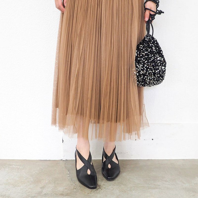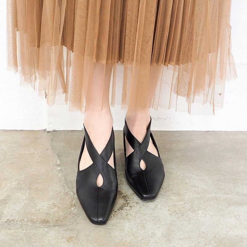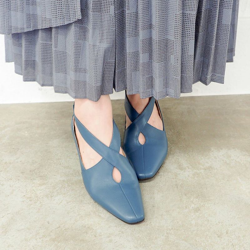 甲を包み込むクロスデザインのアッパーと、開きのあるフォルムがほどよい抜け感を演出するミニマルなシューティ。