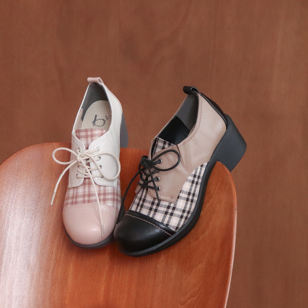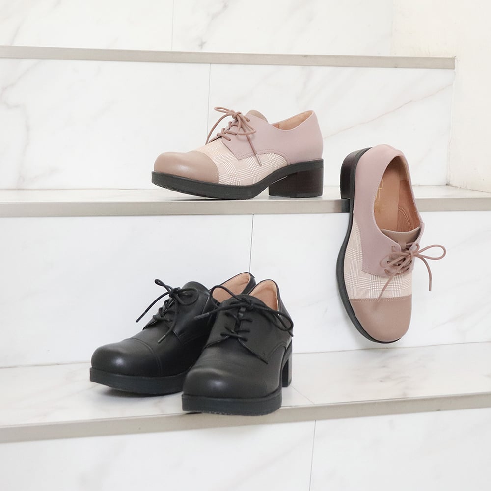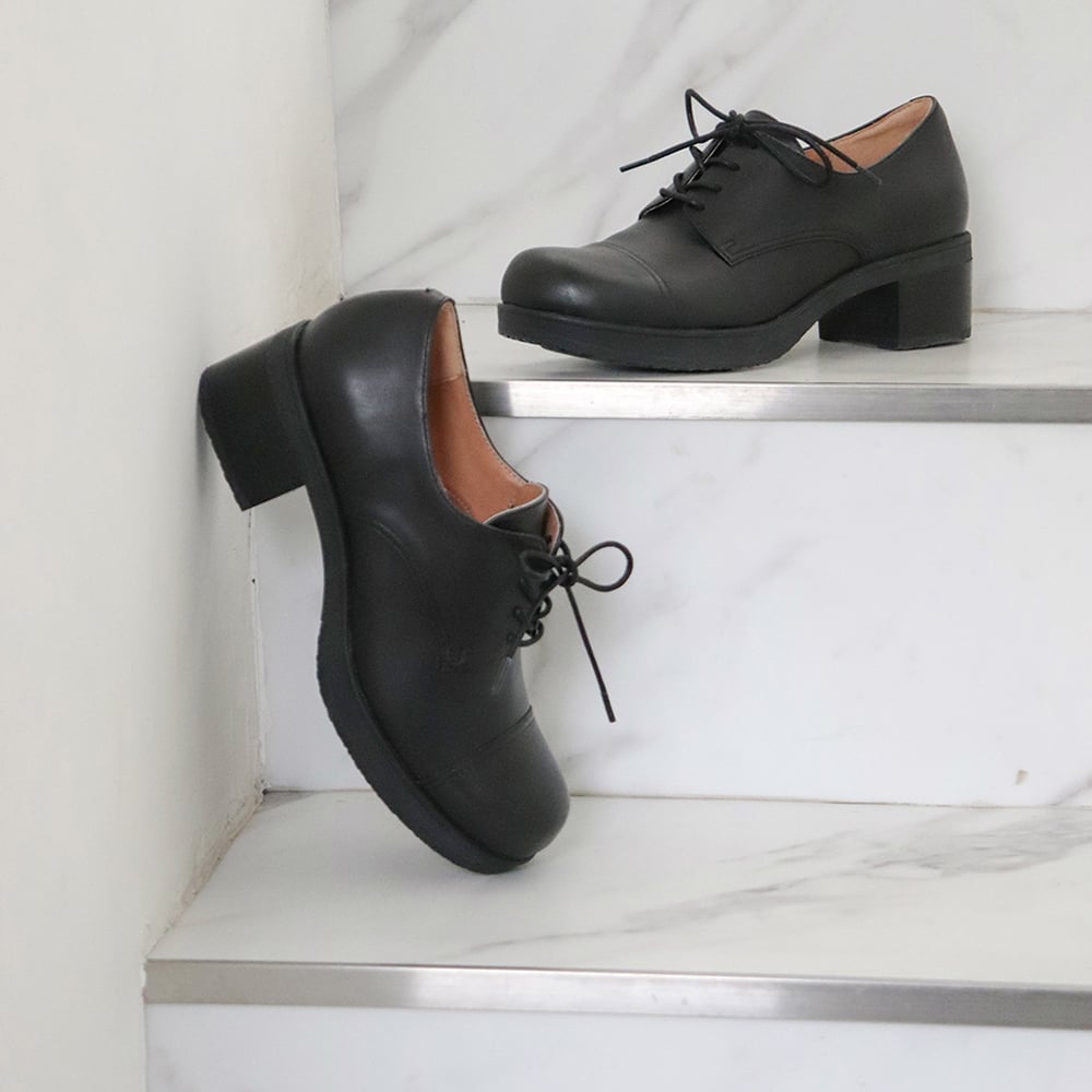 byあしながおじさんが得意とする、おでこのような丸みあるフォルムに安定感のある太ヒールのついたレースアップシューズをご紹介。ブラックを選べばオフィスコーデにも合わせることができ、オンオフ問わず使える気軽さが人気の理由です。