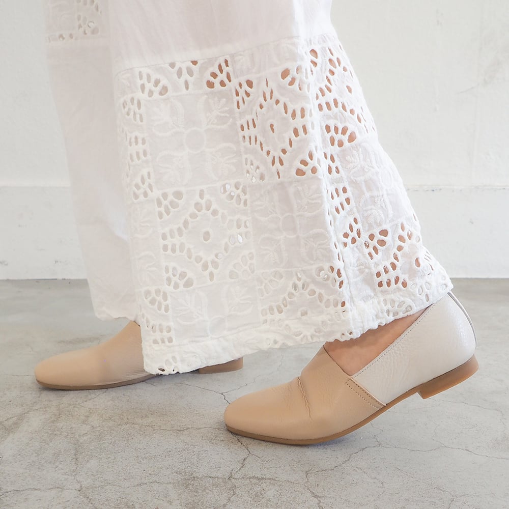 シンプルでミニマルなデザインの中にも、履き口のグログランテープのトリミングがポイントになっています。