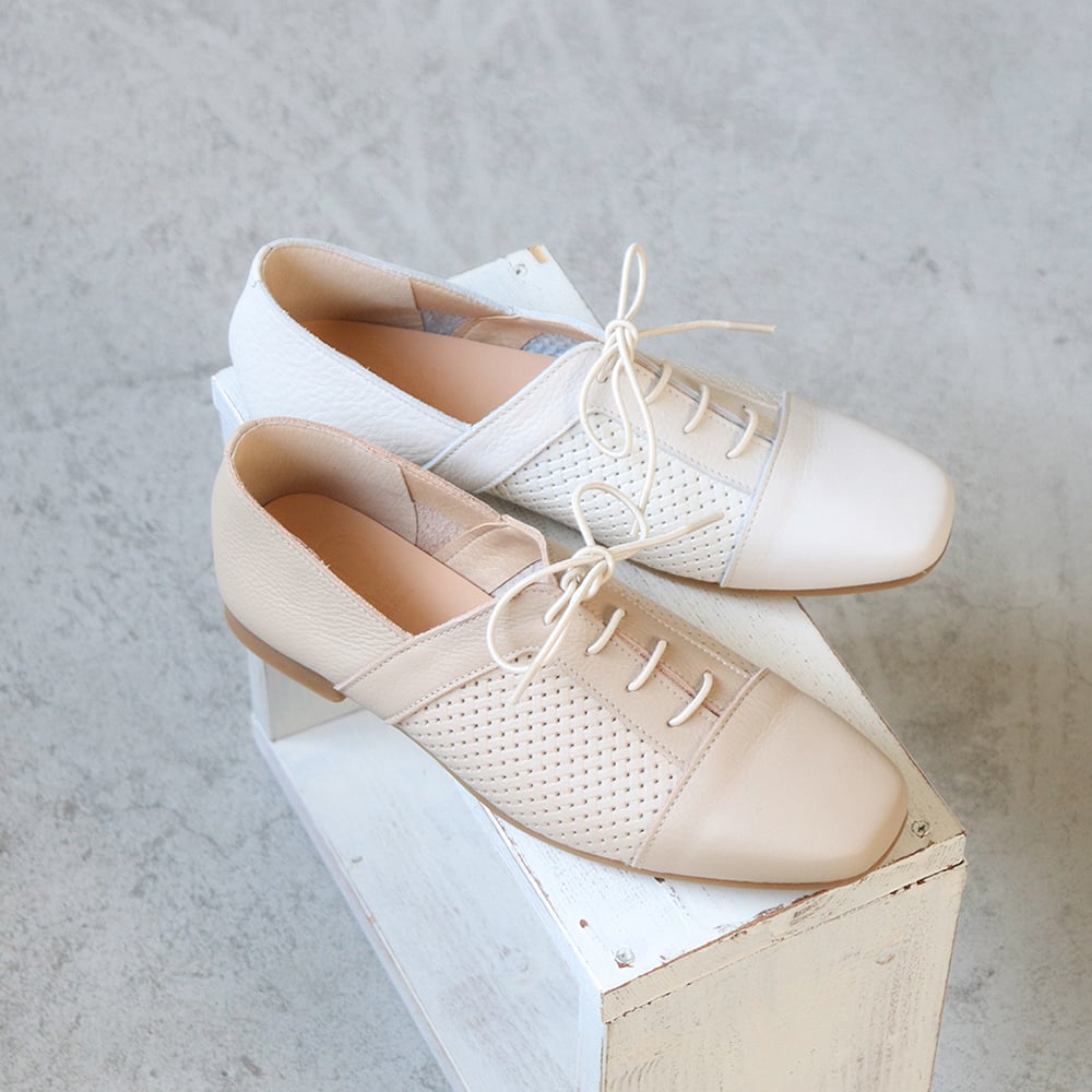 ベージュ×ホワイトのバイカラーになったベージュコンビは、エイジレスな中にもフレッシュさの感じられる足元に。