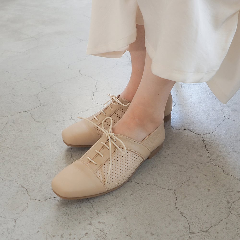 少し重たくなりがちなレースアップシューズを、メッシュ風デザインで春らしく軽やかに仕上げたデザイン。
