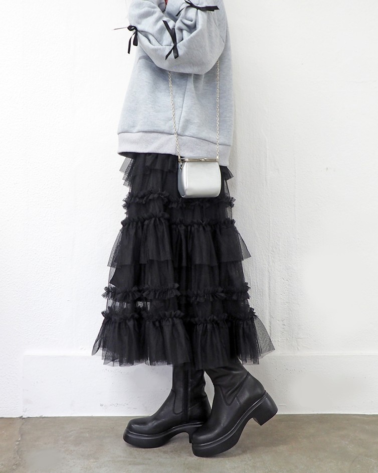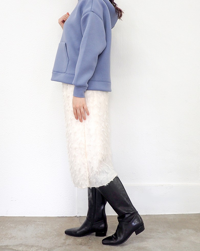 足首にかけてたるませる、ルーズなシルエットが特徴。ヒールを履かなくても脚長効果&脚細効果が期待でき、ミニボトムスと合わせることでY2Kスタイルを楽しめます。