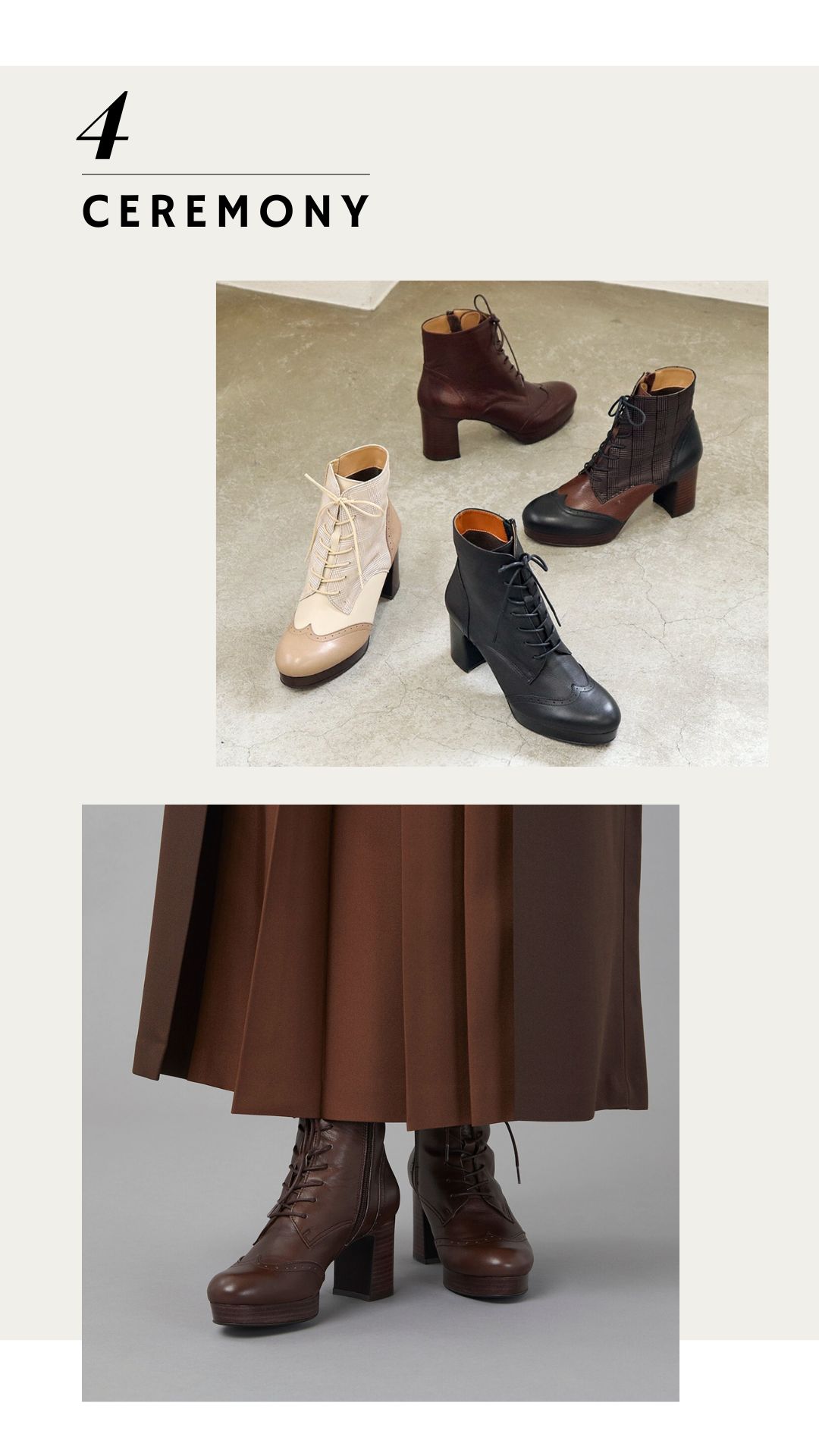 レザーの質感とシルエットのきれいさで、着物の邪魔をせず式典にぴったり。スタイルアップの叶う厚底ヒールもどこか品ありで、卒業式の袴ブーツでお探しのお客さまにはダントツ人気の一足です。